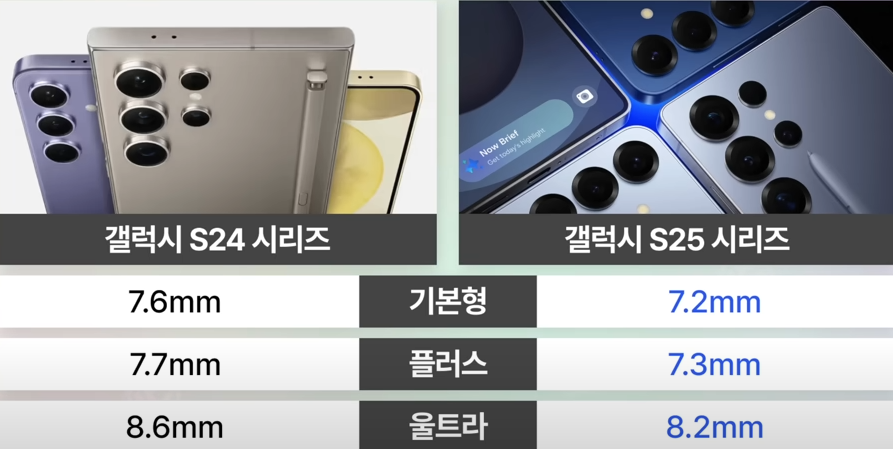 💡 결론: S25는 CPU/GPU 성능이 10~15% 향상되어, 게임·AI 기능·멀티태스킹에서 체감 차이가 느껴질 수 있음.