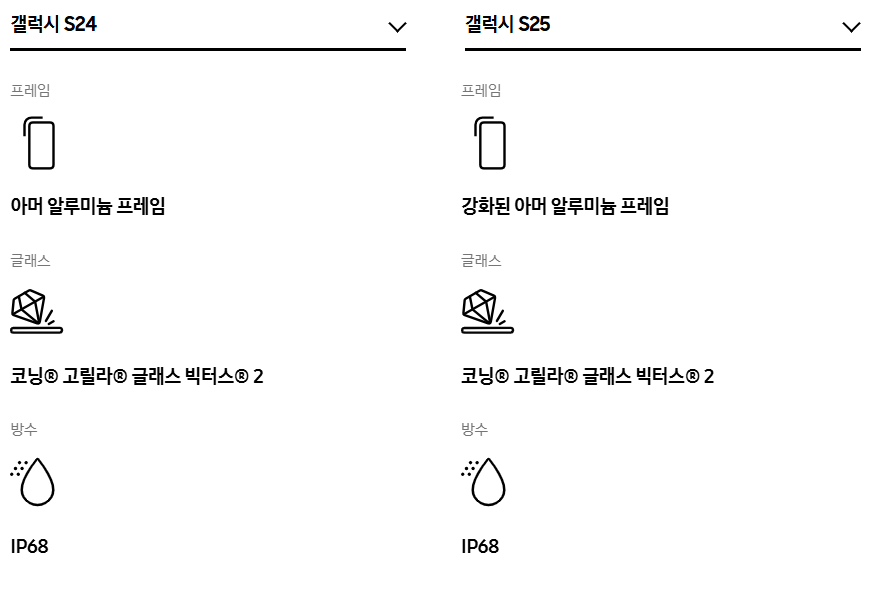 | 내구성 | 갤럭시 S25 | 갤럭시 S24 |