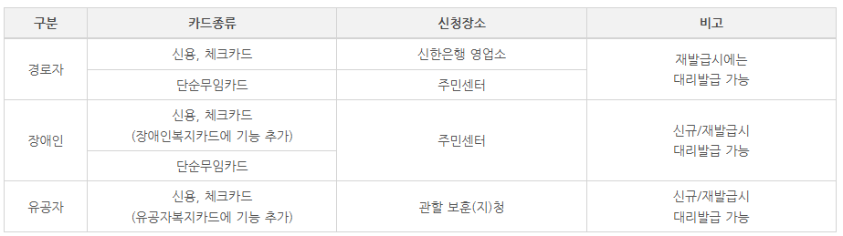 | 구분 | 카드종류 | 신청장소 | 비고 |