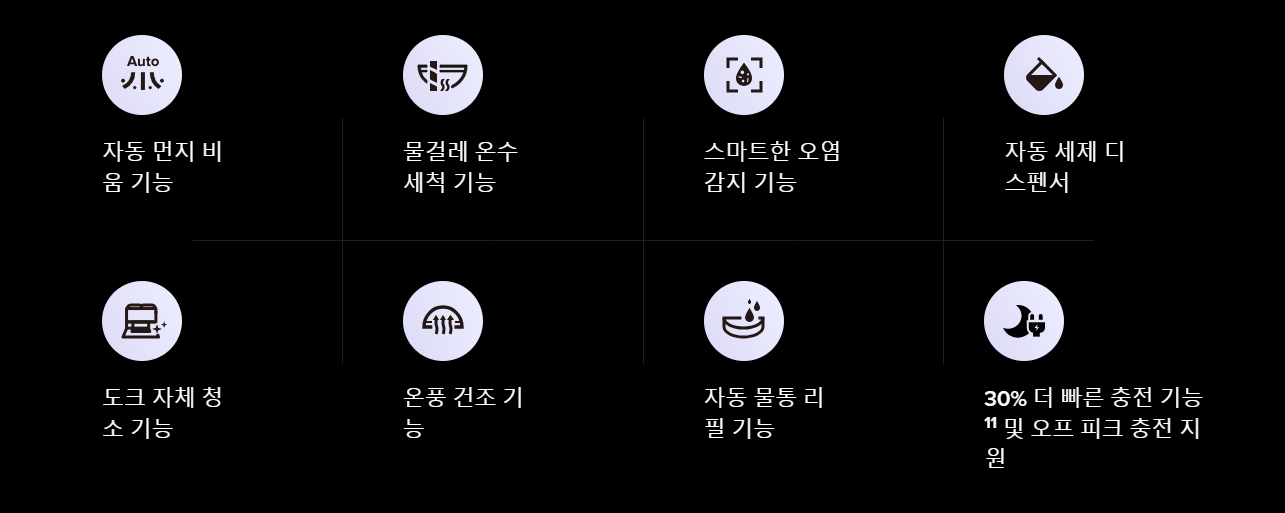 자동 먼지 비움과 물걸레 세척 기능은 시간과 노력을 절약하며, 유지 보수가 간편합니다.