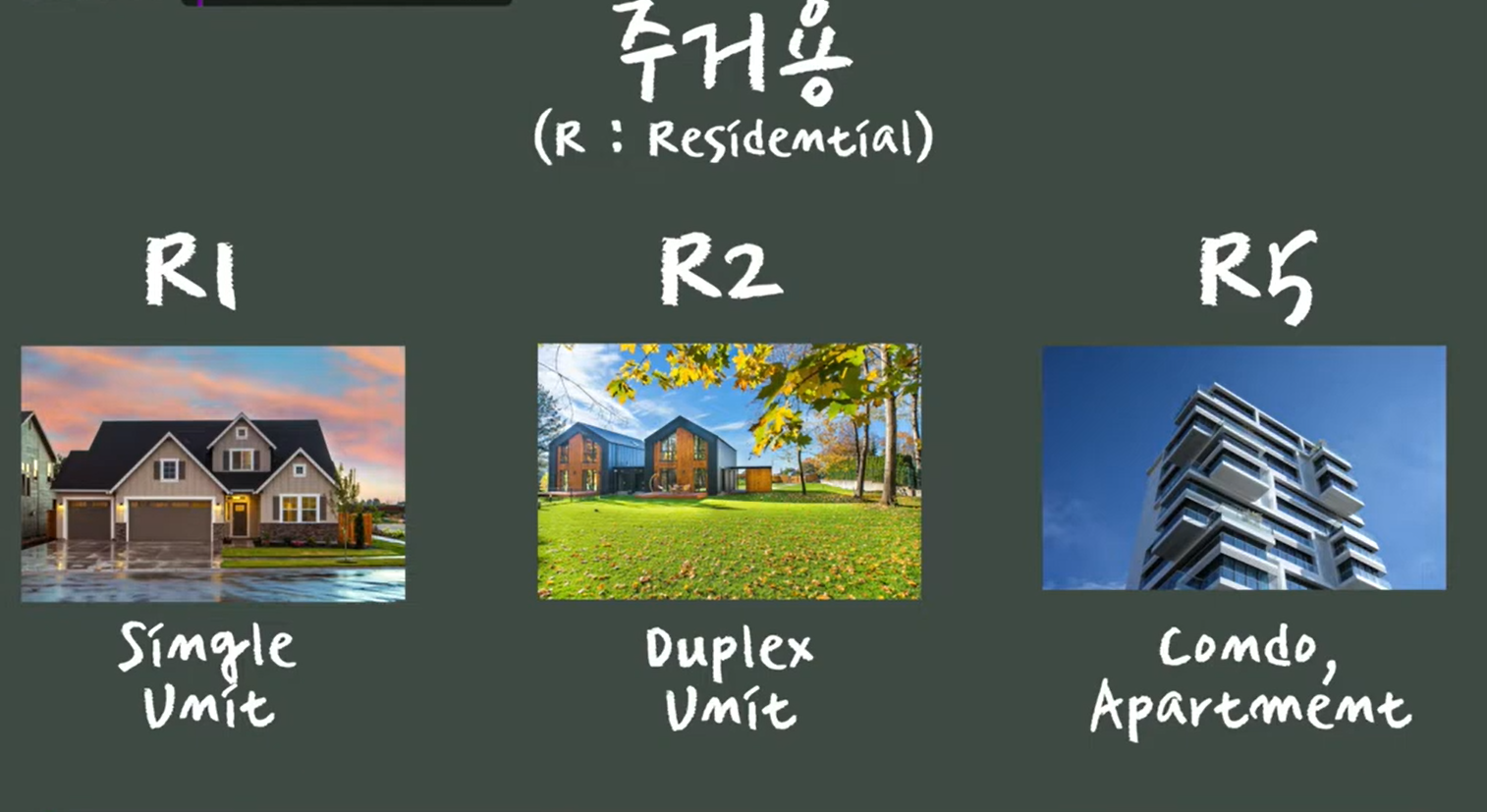 - 세분화: 주거용 지역(R)은 다시 R1~R5로 나뉘며, R1은 단독주택 전용 지역입니다.