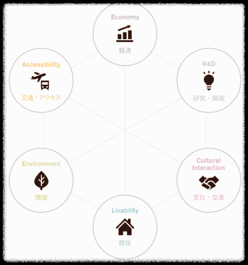 | Given the global competition between cities, the Global Power City Index (GPCI) evaluates and ranks the major cities of the world according to their “magnetism,” or their comprehensive power to attract people, capital, and enterprises from around the world. It does so through measuring 6 functions—Economy, Research and Development, Cultural Interaction, Livability, Environment, and Accessibility—providing a multidimensional ranking. The GPCI is able to grasp the strengths, weaknesses, and challenges of global cities in a continuously changing world not only through a ranking, but also through analyzing that ranking’s specific components. |