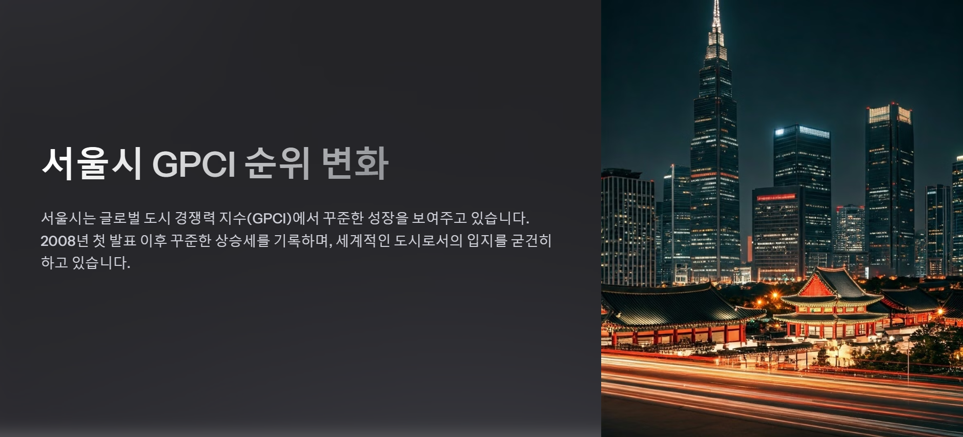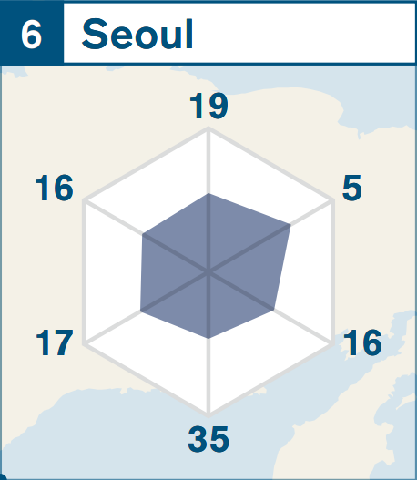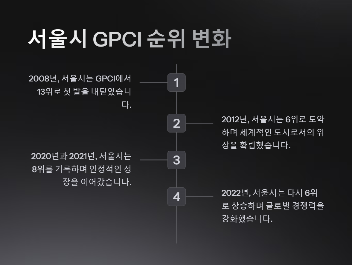 서울시는 GPCI가 첫 발표된 2008년에 13위로 시작해, 2012년에는 처음으로 6위에 올랐습니다. 이후 2020년과 2021년에는 8위를 기록하다가, 이번 발표에서 다시 6위로 상승하며 도약의 발판을 마련했습니다.