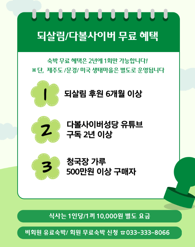성필립보 평창 생태마을 숙박은 온라인 예약이 불가능하며, 전화 예약만 가능합니다. 이는 숙소 특성상 방문 목적과 일정, 객실 상황을 직접 확인하며 조율하기 위한 운영 방식입니다. 실제로 단체·개인·가족 단위 방문 비중이 다양해, 사전 상담을 통해 가장 적합한 객실을 안내받는 구조입니다.