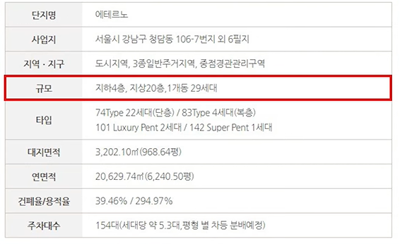 에테르노 청담은 지하 4층에서 지상 20층까지 이어지는 총 29세대로 구성되어 있으며, 각 세대는 고급 주거지로서 최적화된 공간 설계를 자랑합니다.