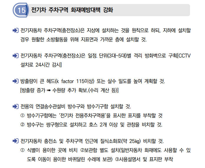 - 배터리 화재 확산 방지 시스템: 배터리 충전소나 주차장에는 배터리 화재 확산 방지 시스템을 설계하여, 배터리 팩에서 화재가 발생할 경우 이를 다른 차량이나 구역으로 전이되지 않도록 차단하는 구조를 마련해야 합니다.