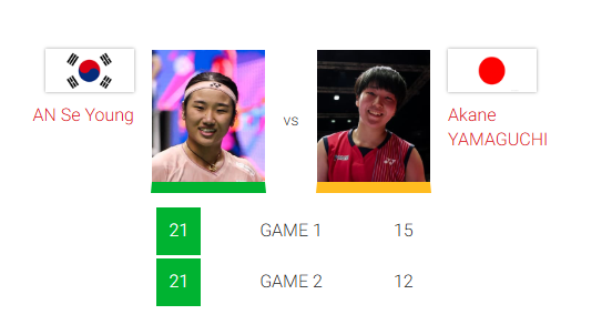 후반에도 흐름은 달라지지 않았다. 야마구치가 추격을 시도했지만, 안세영은 침착하게 상대 공격을 받아내며 점수 차를 유지했다. 결국 상대의 클리어가 라인을 벗어나며 21-12로 경기를 마무리했다. 경기 시간은 38분, 스코어와 내용 모두 완벽에 가까운 승리였다.