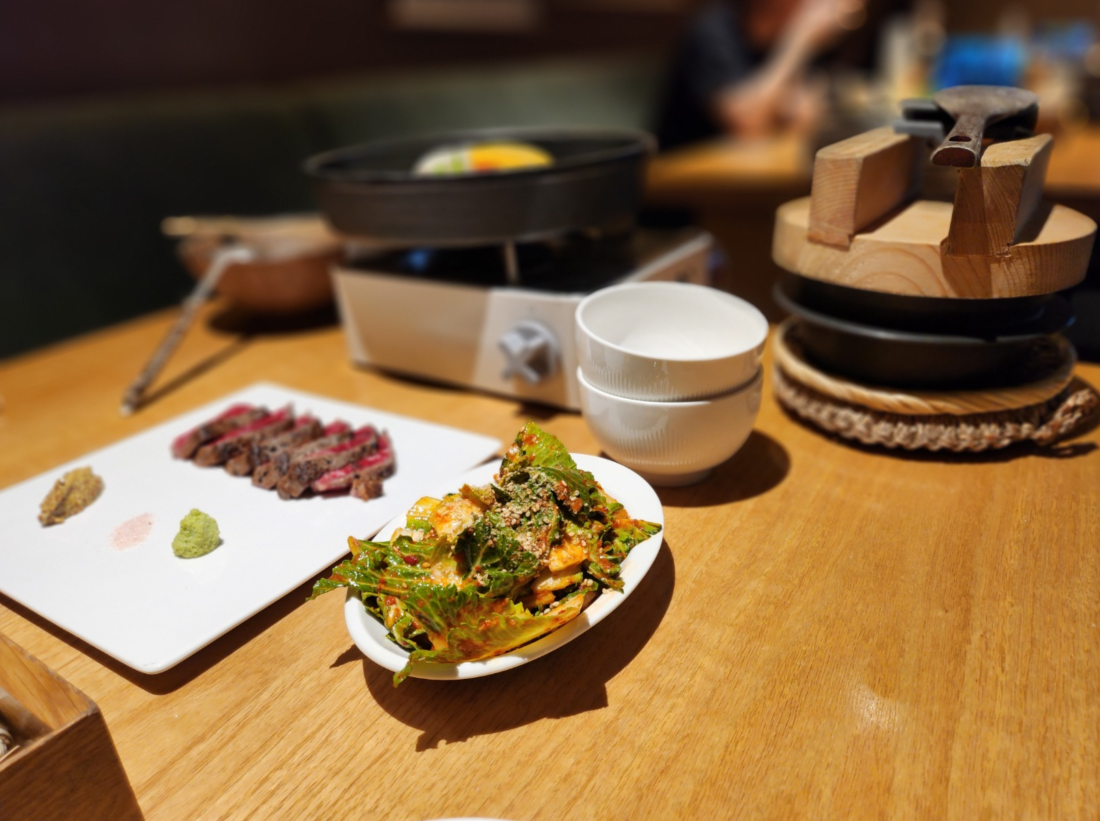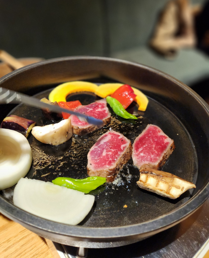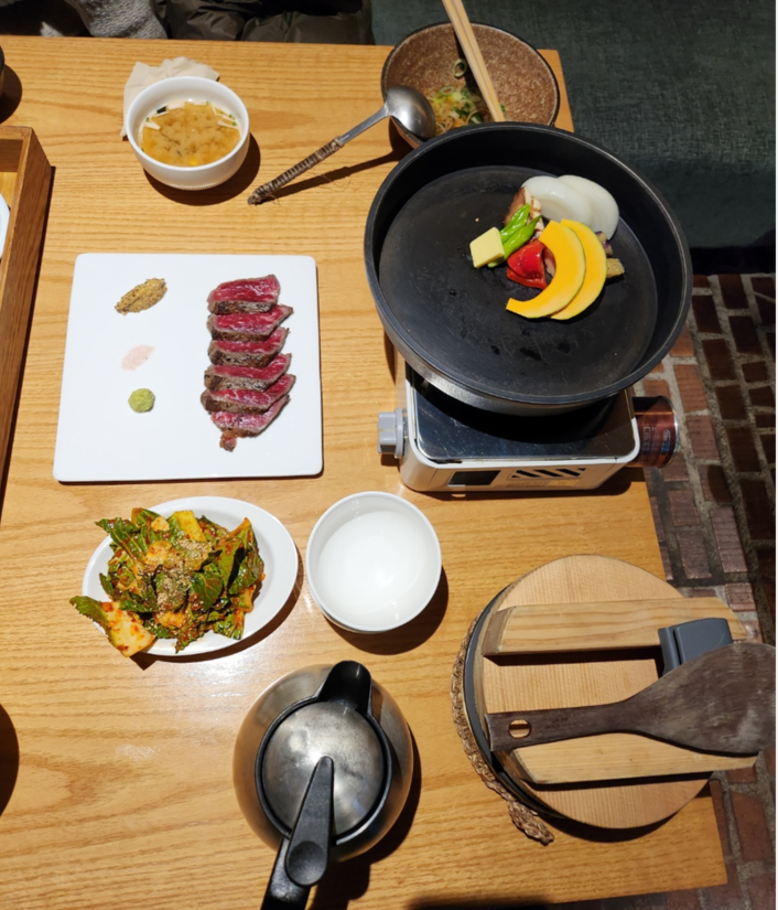 - 한우 스테이크 – 원하는 굽기로 직접 조리