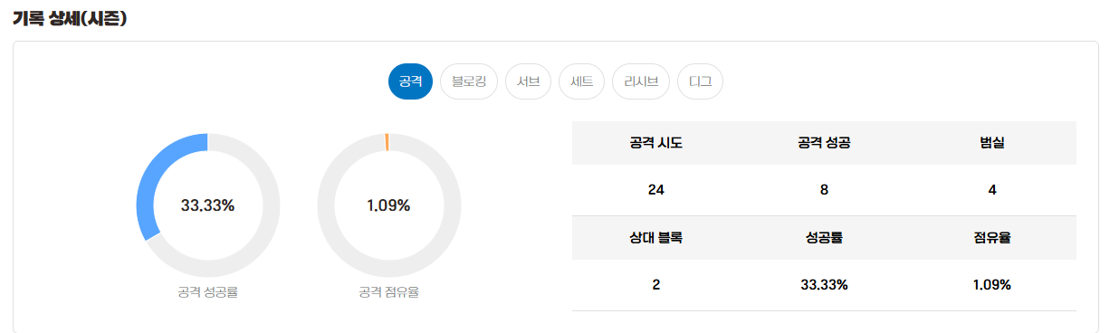 공격 성공률 33.33%는 공격형 선수 기준으로는 낮아 보일 수 있어요.