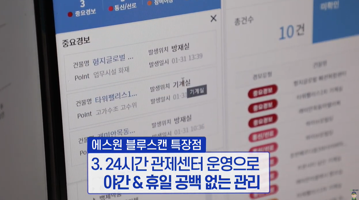 에스원의 블루스캔은 사물인터넷(IoT) 기술을 활용해 건물 내 다양한 이상 상황을 실시간으로 감지하는 스마트 건물관리 솔루션입니다. 이 혁신적인 시스템은 화재, 침수, 정전과 같은 재난 상황을 모니터링하며, 즉각적인 대응이 가능하도록 설계되었습니다. 이를 통해 관리자는 실시간으로 이상 신호를 감지하고, 신속하게 대응할 수 있는 환경을 갖추게 됩니다. 특히, 블루스캔 관제센터에서 24시간 데이터를 모니터링하며 필요한 경우 긴급 조치를 자동으로 실행하는 점이 돋보입니다.