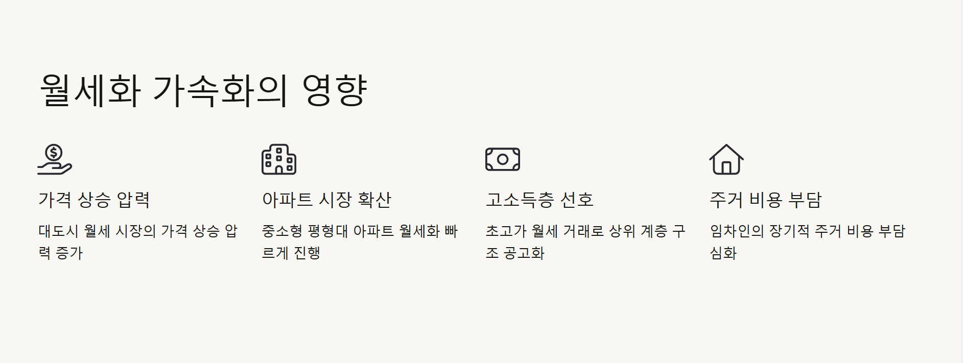- 정책적으로 월세화를 방지하거나 임대 시장을 안정화시키는 추가적인 대책이 없다면, 임차인의 주거 비용 부담은 장기적으로 심화될 것입니다.