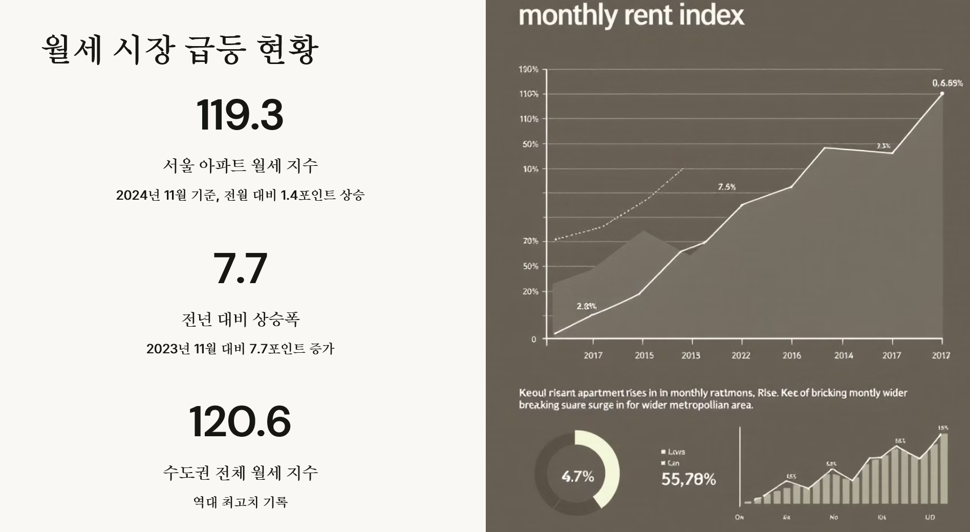 서울부동산정보광장의 자료에 따르면, 2024년 11월 기준 서울 아파트 전·월세 거래에서 **월세 비중은 44.1%**로 전월(41.2%) 대비 상승했습니다. 이는 매수 여력이 부족한 수요자들이 전세를 선택하지 못하고, 더 낮은 초기 자금이 필요한 월세로 전환하고 있음을 나타냅니다.