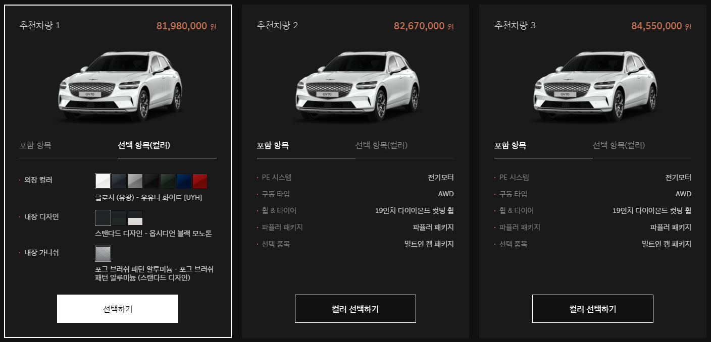 - GV70: 강인한 SUV의 실루엣에 전기차 특유의 미래지향적 디테일을 가미했습니다.