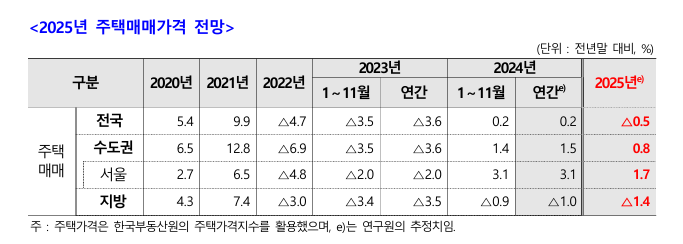 지방은 1.4% 하락이 예상되며, 인구 감소와 경기 위축이 주된 하락 요인으로 작용할 전망입니다. 수도권과 달리 지방은 주택 시장 회복이 다소 더딜 것으로 예상됩니다.