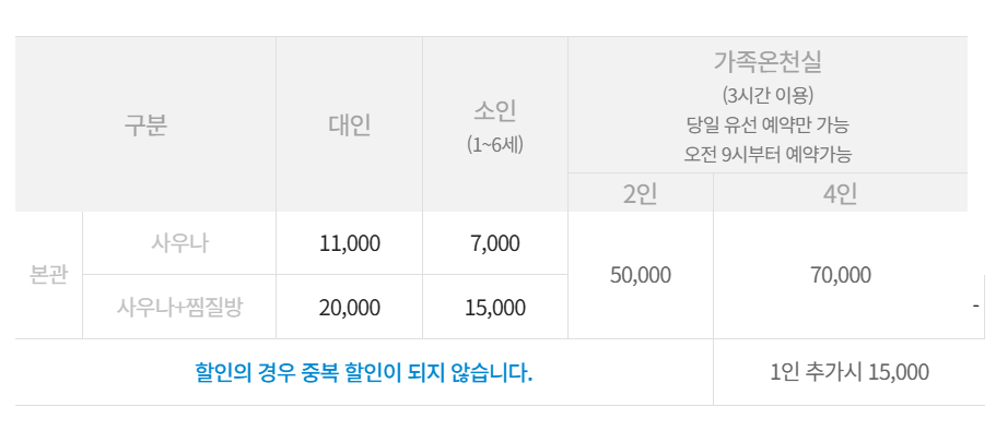 - 찜질방: 대인 20,000원 (옷 대여료 포함)