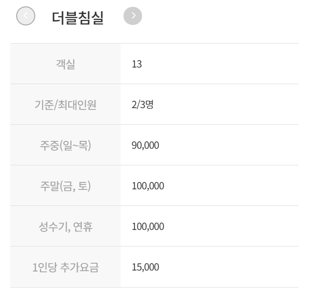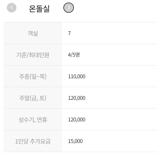 - 온돌/침대실: 10만 원대 초중반 (평일 기준)