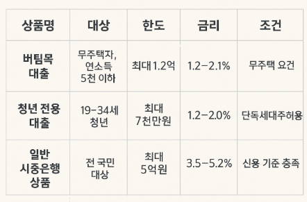 | 버팀목 대출 | 무주택자, 연소득 5천 이하 | 최대 1.2억 | 1.2~2.1% | 무주택 요건 |