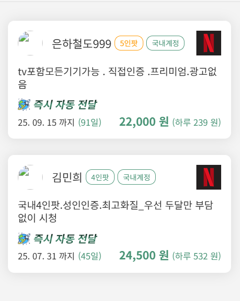 쉐어풀 등에서는 넷플릭스+유튜브 프리미엄 등 패키지로 묶인 상품을 저렴하게 제공해 효율적입니다. 한 번의 결제로 다양한 콘텐츠를 접할 수 있어 비용 대비 만족도가 높습니다.