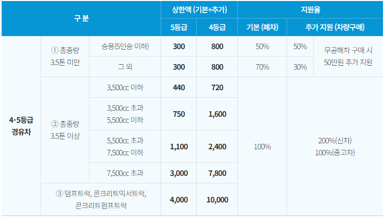 | 4등급 경유차 | 최대 800만 원 | 총중량 3.5톤 이상 차량은 추가 혜택 가능. |