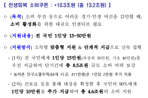 | 민생회복지원금 | 20.2 | 전 국민 차등 지급 (현금·카드 포인트·지역화폐 중 선택) |