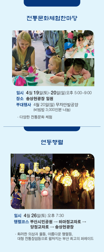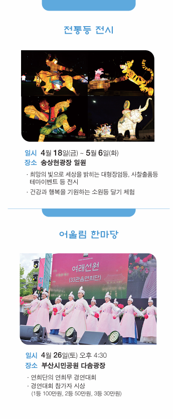 | 용두산공원 전통연등전시 | 5월 1일(수) ~ 5월 12일(일) | 중구 용두산공원 |