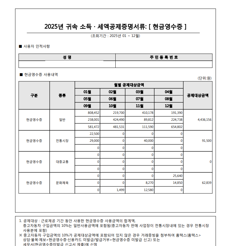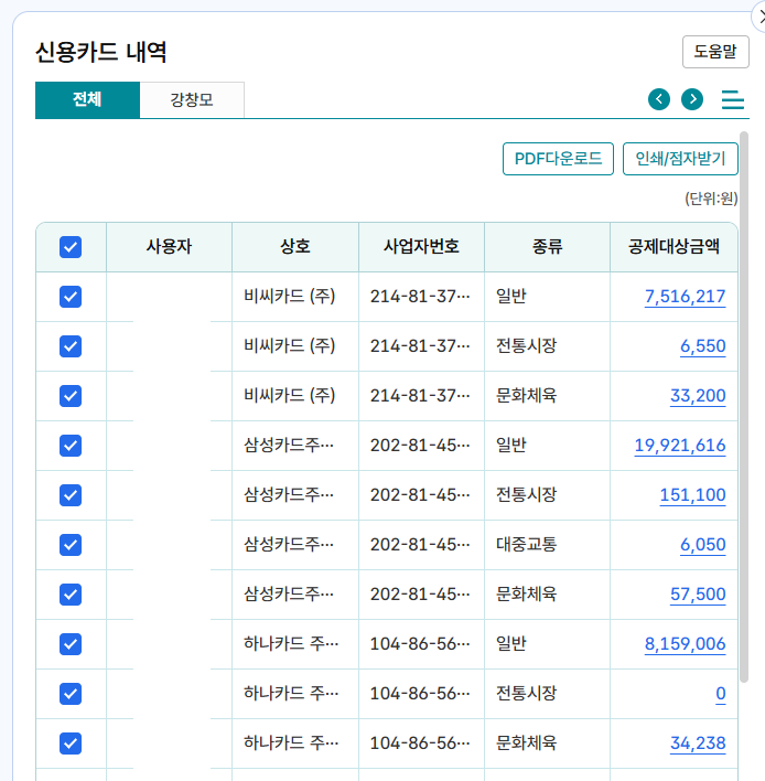 - 신용카드, 체크카드, 현금영수증 사용 내역