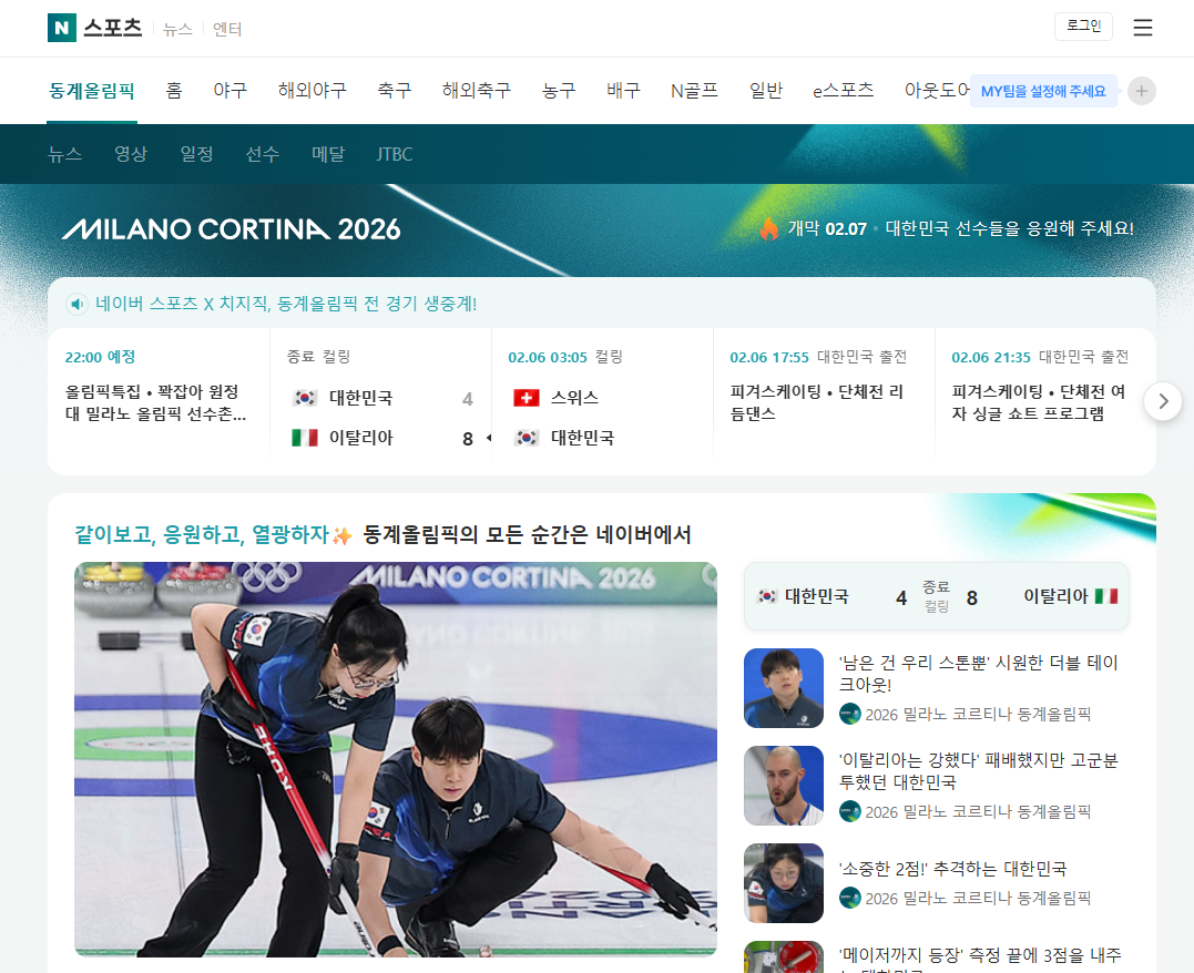 네이버(www.naver.com) → 상단 [스포츠] 클릭 → [올림픽] 메뉴