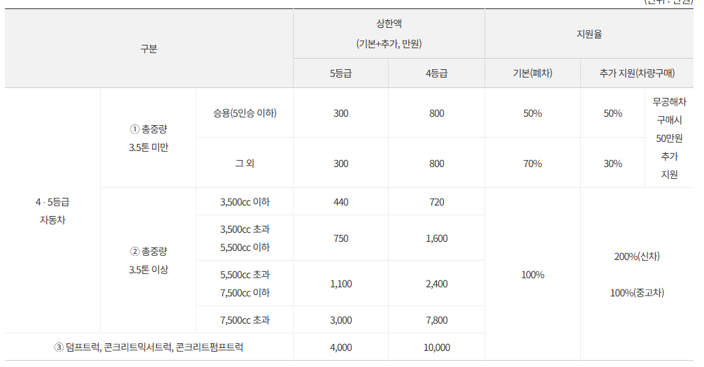 - 무공해차 구매: 기존 차량 폐차 후 무공해차 구매 시 50만 원 추가 보조금.